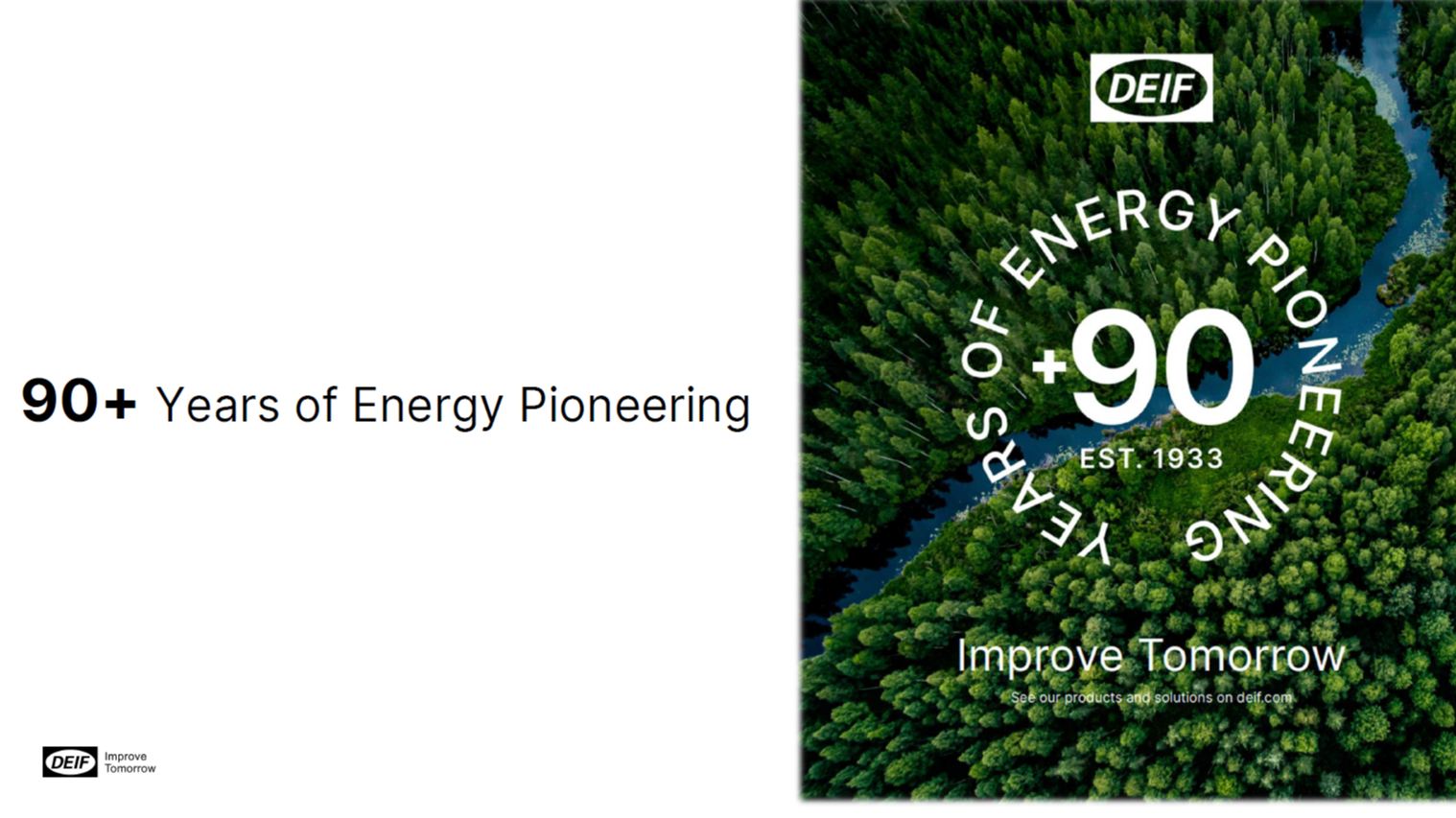 Welcome to DEIF, your trusted partner in intelligent energy management systems. Our mission is to provide the world's best and most reliable energy control and management solutions for a sustainable future. Our extensive portfolio of innovative products and services, including PLC’s, genset controllers, inverters, converters, protection relays, electric propulsion, switchboard and bridge equipment, is designed to meet the evolving needs of the energy sector. We focus on providing solutions that can enhance efficiency and reliability, helping our customers meet tomorrow's demands.